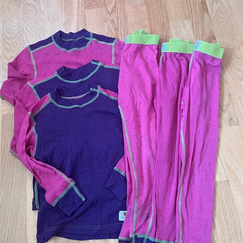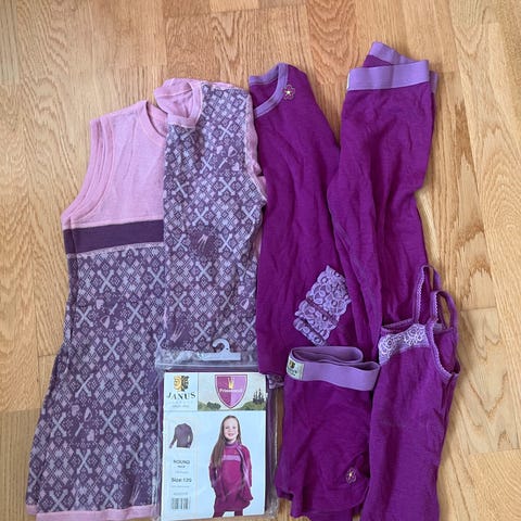 Klespakke fra Janus og nrk ( jul i svingen og julekongen) i str 120/6 år. Enkelte plagg har litt bruksmerker som flekker og andre er veldig pent brukt. I ulike farger som hvit, rosa, lilla og rød.