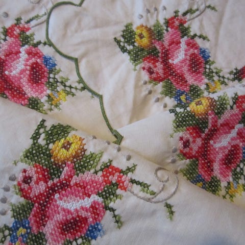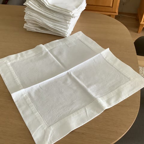 Små servietter (6 stk). Firkantet (32x32 cm). Offwhite bunn med striper i brunt, beige og lyseblått. Kjennes som bomull. Antar fra 1960/1970-tallet. Nyvasket og strøket. Ingen slitasje, men to av serviettene har dessverre flekker (se de to siste bildene).