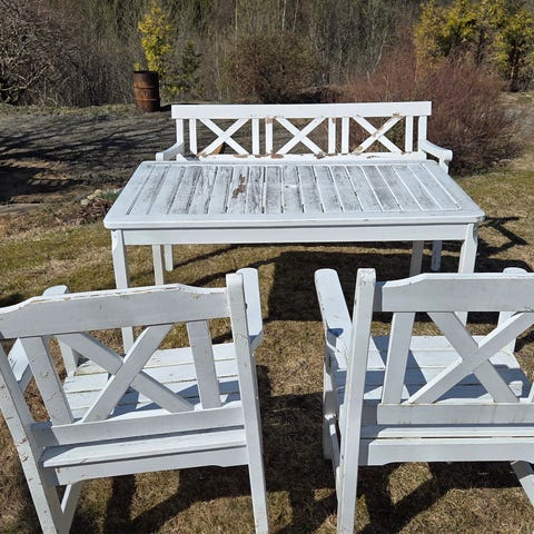 Møblene er som nye. Bordplatene er i stein og bordet er meget stødig. Møblene tåler vind godt.