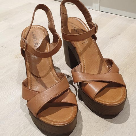 Sandaler med kilehæl, og platå i forfoten. Veldig behagelig å bruke da skoen er bygd opp med god pute inni. Selges da de ikke blir brukt.