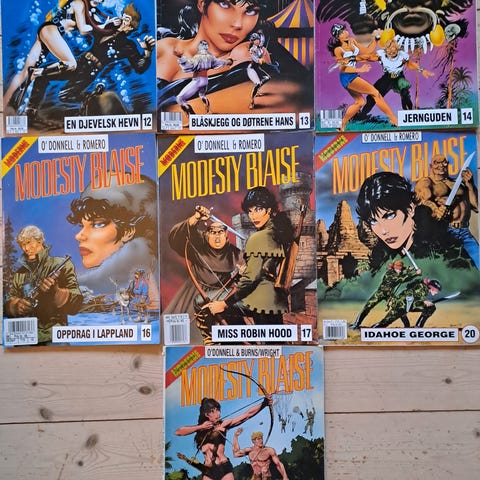 Moderne serieklassikere, Modesty Blaise album 3, 4, 5, 6, 7, 9, 10, 11, 12, 14, 15, 17, 18, 19, 22, 24. Veldig pene, nesten som nye. Pris pr. stk. Gi bud på noen eller alle.