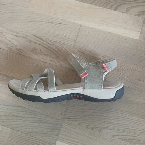 Selger skjønne sandaler med kilehæl. Reguleres bak. Høyde ca 5 cm. Ekte lær. Veldig lite brukt.