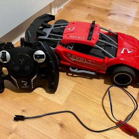 - radiostyrt bil, grønn og blå, mangler lader, batterilader og antenne på kontroll, ikke brukt på flere år på grunn av mangel på lader, -1000kr