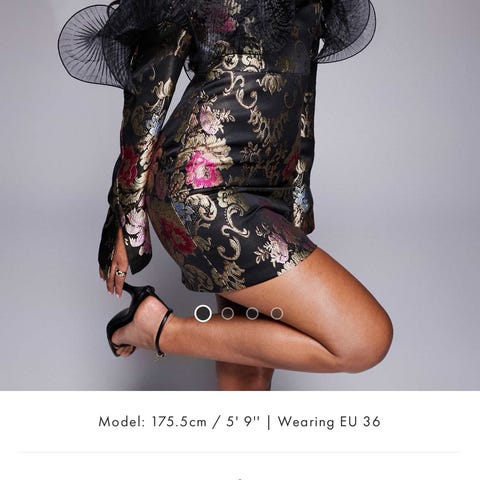 Bildet er lånt fra nettside. Beskrivelse fra nettsiden « ASOS DESIGN high neck drape maxi dress in floral fil coupe with belt» . Brukt kun 1x til bryllup. Str. 40, men passer en 38. Kjolen tettsittende ved rumpe og hofte, og løsere ved brystpartiet og ermene. Utsolgt på nettside.