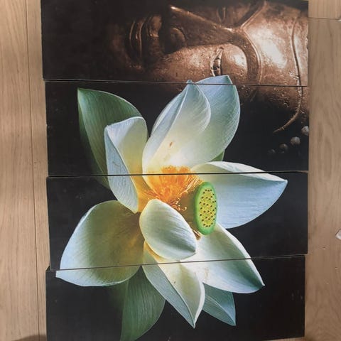 Dekorativ veggkunst laget av trepaneler med motiver av en tiger og bambus samt et ansikt. Panelene har en svart bakgrunn med naturlige trefarger i designet. Passer godt til moderne eller tradisjonelle interiørstiler, og kan brukes i stue, kontor eller annet oppholdsrom. Dimensjoner og spesifikasjoner varierer per panel, men passer godt sammen. Selges enten hver for seg for kr 100 per eller samlet for kr 180.