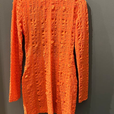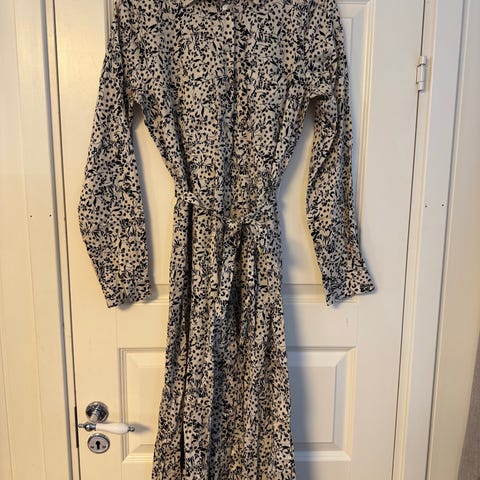 Kjole i myk japansk silke designet i en dus mosegrønn farge. Den har en forlenget lengde og en klassisk krage, med tillegg av et midjebelte som du kan justere til den beste passformen. Brukt ved en anledning. Ny pris 7900kr, har kvittering.