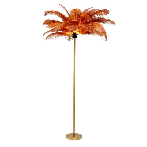 Ekte strutsefjær. Lampefoten er i gull og formet som en strutsefot.