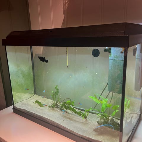 1 stk 8 kantet akvarie med møbel, 50x50x50cm total høyde ca 110cm inkl. skapet ,en liten pumpe m.internt filter , noe filterduk og varmekolbe følger med
