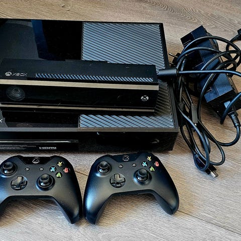 X-box one konsoll med tre trådløse kontroller, dokkingstasjon for to kontrollere.