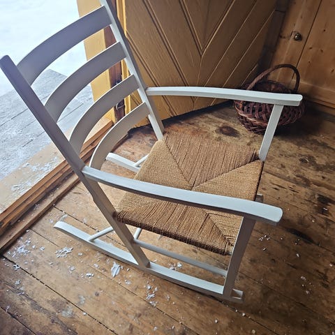 Jær gyngestol. Stolen er pusset opp på Valdres Arbeidssenter på Leira. Malt opp og nytt flettet sete og rygg.