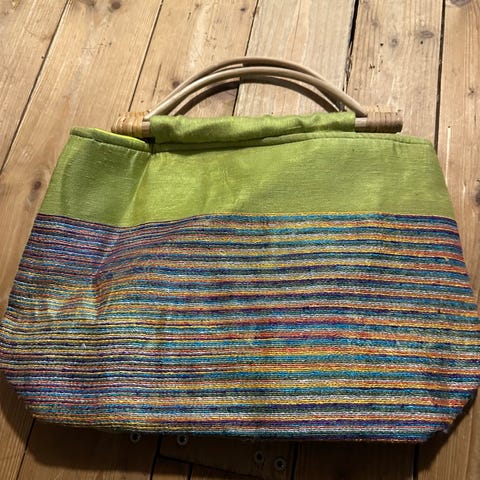 Håndlaget vevd veske i stoff. Denne unisex vesken har et stripete mønster i røde, blå og hvite nyanser. Den er ideell for daglig bruk med en praktisk størrelse som gir god plass til nødvendigheter.