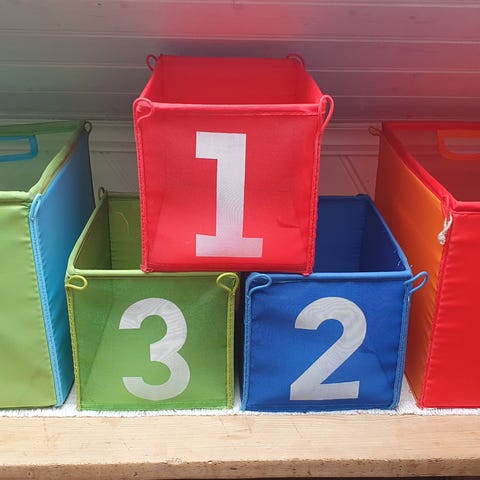 2 stk borrelås oppheng til oppbevaring med 4 rom i rød og blå. Perfekt for bamser for eksempel.