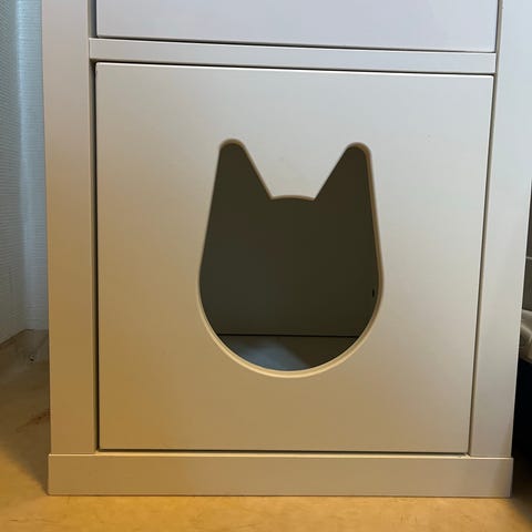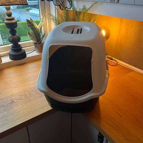 Super fødekasse til katt, medium/liten rase. Tar liten plass når den ikke brukes. Kattene er veldig tilgjengelig, samtidig som at det er en trygg hule. Malt tre.