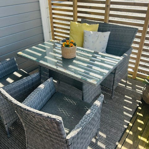 Godt brukt hage spisebord med 4 stoler.