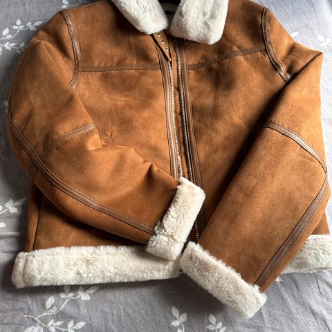 H&M «Divided» fake fur jakke i fin blå-grå farge (kommer ikke helt riktig frem på foto). Lie brukt, nyvasket på finvask. Str. M men passer også S.