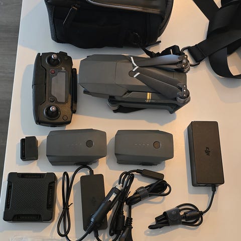 Selger en pakke med en pent brukt DJI Mavic Pro. Dronen er lite brukt og selges med alt utstyret som vises på bilde. 2stk kontrollere, hvorav en er ubrukt.