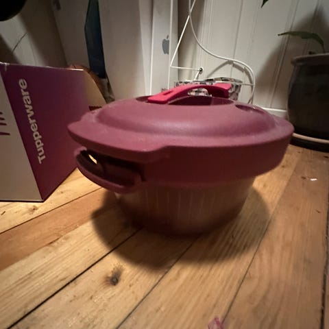 Selger min grei brukte Tupperware Micro urban. Den både koker og damper mat i mikrobølgeovnen.. Kan koke både pasta og ris - samt dampe grønnsaker og fisk, m.m.