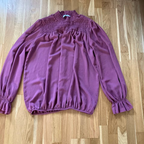 Selger en pent brukt bluse fra Zara i en nydelig lillafargevi størrelse Small. Blusen har supersøte detaljer på kraven og mansjettene, og lukkes med en perleknapp i nakken.