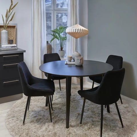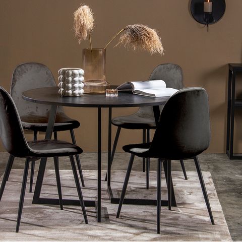 Nydelig spisebord med kjelgeformet fot trukket i svart ask finer. Basen er trukket i svart 3D folie. Inkluderer 1 stykk illeggsplate 120x45cm. Plass til 4-8stk rundt bordet. Enkelt å montere.