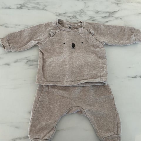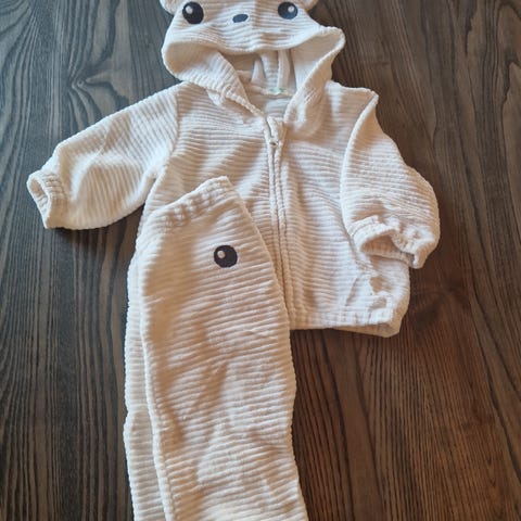 Søt lyserosa joggedress fra Benetton i str 56. Hettejakke med glidelås og ører på hetten, joggebukse med bjørn bak.