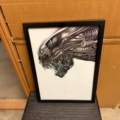 Selger tegning på grå papir med tusj teknikk, motiv, små hjernesuger romvesener. Kunsten er i A4 størrelse ca, rammen er enkel og er 30x 40 cm. Rammen er med på kjøpet