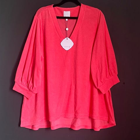 Deilig lysgrønn genser i frotte. Den har A-fasong og vide armer og er veldig behagelig. Passer til shortsen og en bukse i en annen annonse. Genseren er litt oversize.