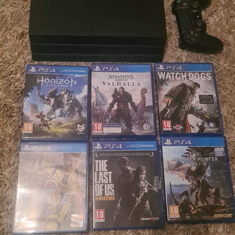 - PS4 Pro 1TB + HDMI, strømkabel, Micro USB-ledning