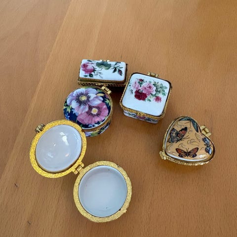 Et nydelig håndmalt porselensskrin, dekorert med blomster og gulldetaljer. God plass til smykker og andre hemliser.