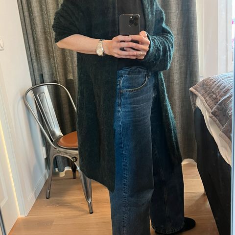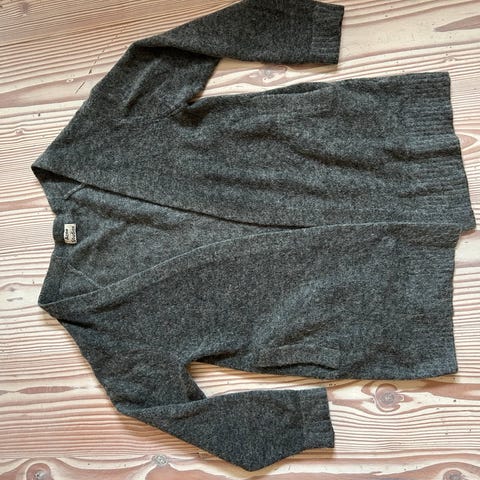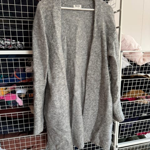 Grå cardigan fra Acne (lang modell), selges kr 500. Jakken er i god stand, men er brukt relativt mye. Bør gås over med nuppefjerner. Derav den lave prisen.