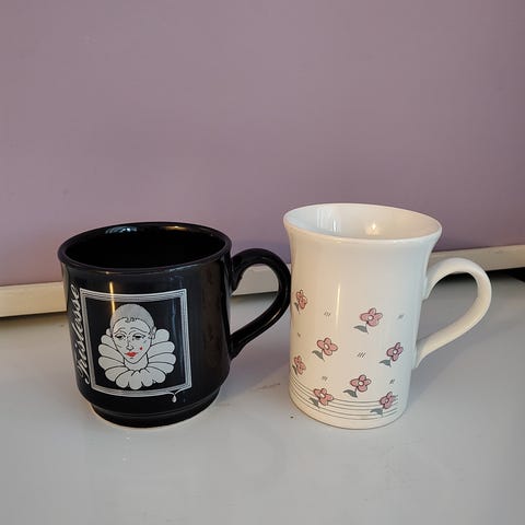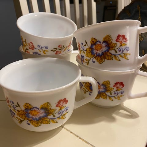 Kopper med retro look i jordfarger, rød, brun, grønn. Hjerte, striper, fantasi mønster. Den ene har noen produksjon prikker inni. Selges samlet.