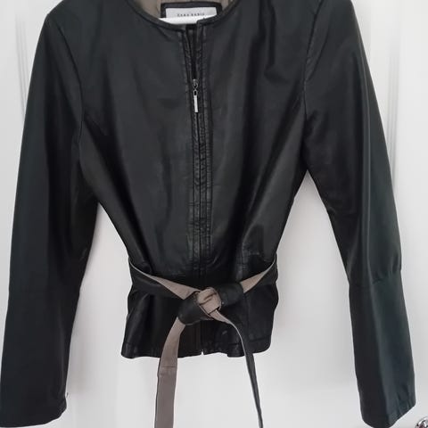 Imitert skinnjakke fra Zara, fin innsvingt modell. Pent og lite brukt, innvendig "vaskelapp" er klippet av.