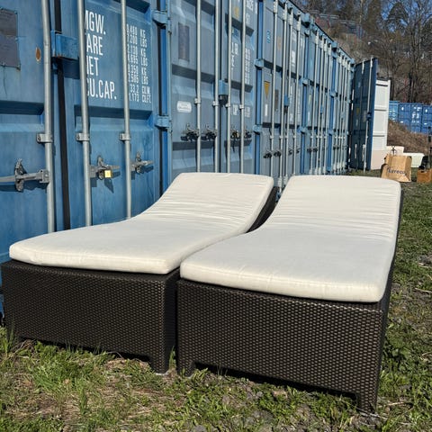 Selger to stykk like Segerön solsenger. Den ene har vært skrudd sammen og stått ute noe, men ser ubrukt ut. Og den andre er helt ny og kommer i emballasje. Begge solsengene selges med puter og Frösön/Duvholmen trekk som selges separat på IKEA.