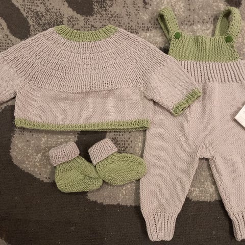 The set contains 2 rompers, 2 shorts, balaclava, scarf, and 3 pacifier holders, the sizes vary from ca 3M up to ca 18M, most of them are made of wool