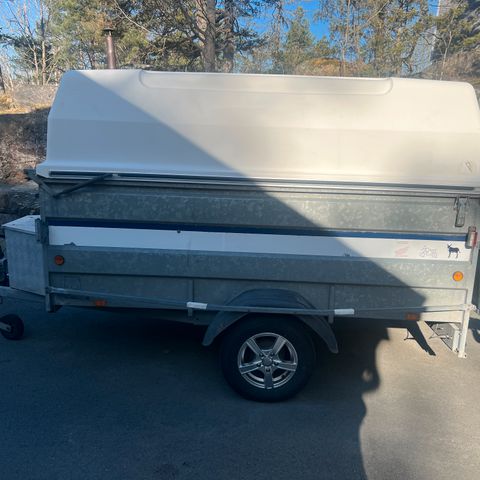 Det er montert 4 stk thule sykkelstativ i grinden oppå, kan følge med for 3500kr. kjørekappe medfølger.