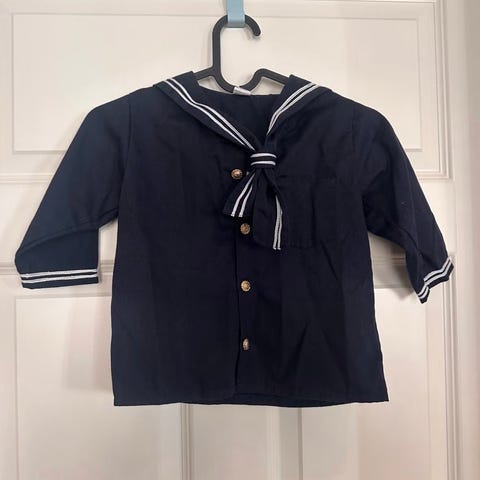 Flott matrosdrakt fra 80-tallet. Som ny. Stoff er i ull (kanskje noe blanding?). Vanlig å bruke til fint før i tiden.