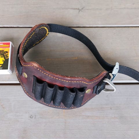 Mørkt brunt patronbelte i lær med grønn filt.For hagle kaliber 12.