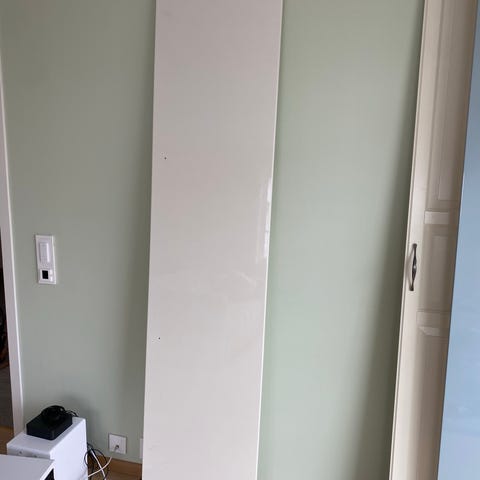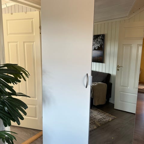 Garderobeskap med skuffer og hyller. Dør i høyglans. Noen bruksmerker.