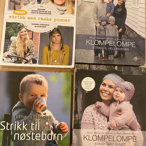 Her kan du kjøpe flotte bøker med herlige, lune strikkeoppskrifter til baby og barn og flott design til voksne. Norsk Strikkebok og Dikt i masker er flotte klassikere. Alle bøkene er meget pent brukt og framstår som nye. Se pris ved hvert bilde. Hvis enkeltbilde er borte, er boka solgt. Hvis du er rask og ønsker å kjøpe alle bøkene, blir det en lavere pris. Ta kontakt og gi beskjed om hvilke bøker du ønsker, så ordner jeg det. Denne annonsen tar utgangspunkt i liten sending, men flere bøker kan gjøre at man må opp et hakk i forsendelse.