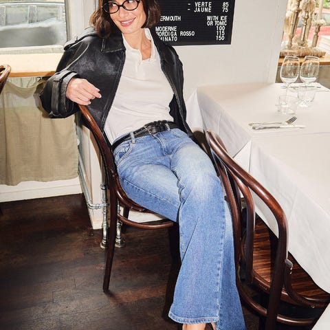 Disse jeansene er stretchy og har en høy midje-passform. De har utsvingte ben.