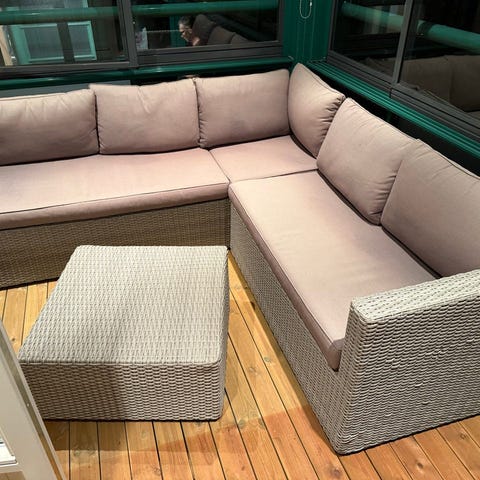 Hagemøbler fra Season of Scandinavia med to stoler, bord og to stk fotskammel selges. Møblene og putene er i bra tilstand. Bord er godt brukt. Selges som det er.