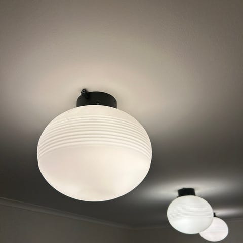 Klassiske bordlampe i kraftig hvitt opalinglass produsert av Randsfjord glass på 1970-tallet. Designet av Willy Torgersen (1929-1995). Lampen er tung og måler 29 cm opp til holder for lyspøren. Diameter bunn er 12 cm.