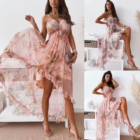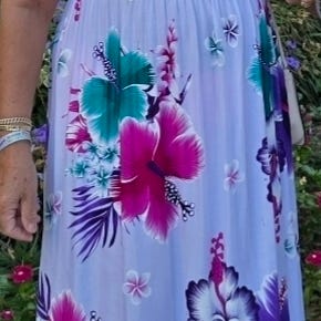 Sommerkjole i rosa farge med hvite blomsterdetaljer og frynser langs ermene. Størrelse One Size. Laget av lett materiale egnet for sommerbruk.