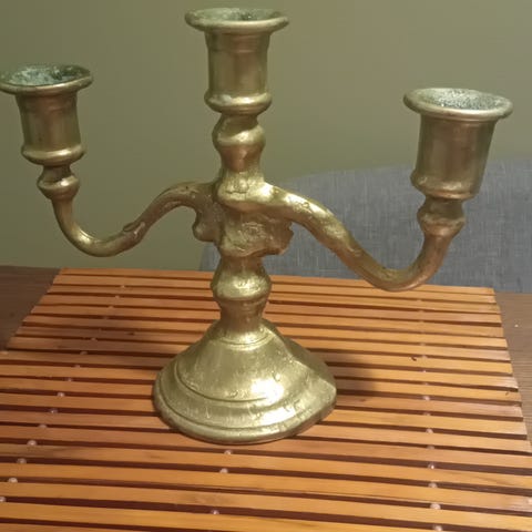 3-armet lysestake i tung messing med en nydelig tekstur. Denne modellen finner man flere av på bruktmarkedet hvis man ønsker seg et par.