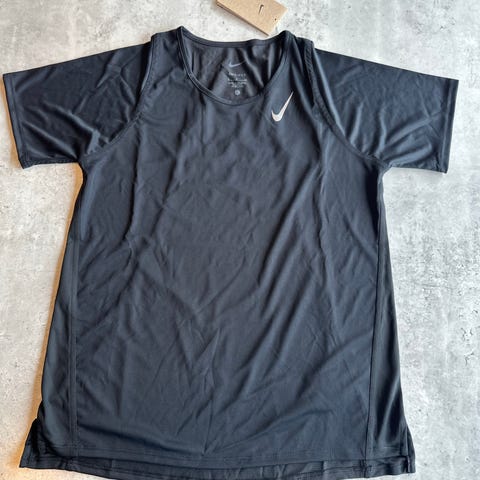 Nike Dri-FIT t-skjorte i helsvart med reflekslogo – designet spesielt for løping. Lett og pustende materiale som holder deg tørr og komfortabel under økten. Brukt, men i svært god stand – ingen hull, flekker eller tegn på slitasje.