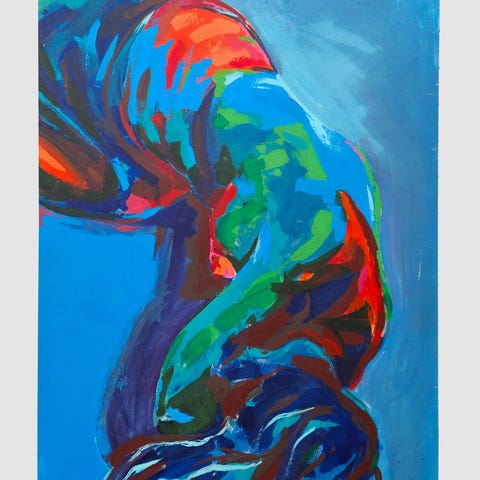 Akrylmaleri 145x84 cm av den jamaicanske kunstneren Damion Prince Richards, som er utdannet ved kunstuniversitetet i Havanna og har hatt kunstutstillinger i flere land, bl.a USA, Tyskland og Norge (Bergen, Arendal og Vevringutstillinga)