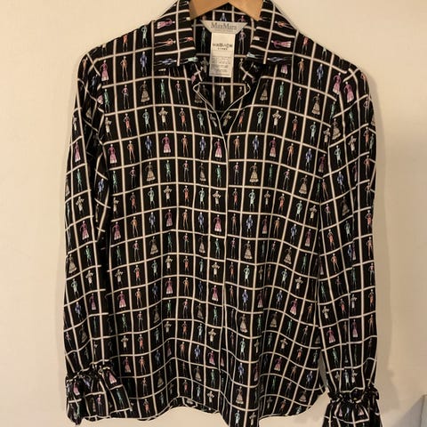 Original og kul bluse skjorte fra Max Mara i 73% bomull. Størrelsen er 36 norsk str, 40 italiensk, men da den er litt oversized passer den både S og M fint. Laget i Portugal.