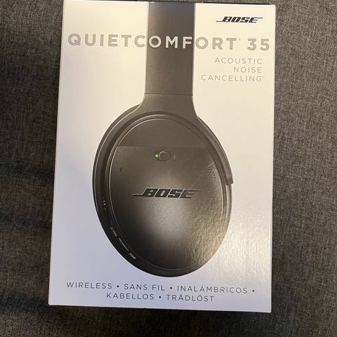 Her er et fint eksemplar av de berømte Bose QuietComfort 35 series 2 hodetelefoner med fine lyse grå øreputer.