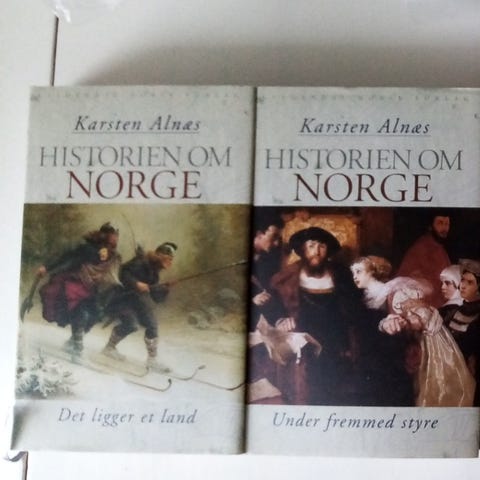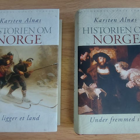 Bind 1 og 2 av serien Historien om Norge av Karsten Alnes. Bøkene har aldri vært åpnet og fremstår som nye.