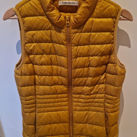 Fin vest i jeans farge i stoff Tencel, tynt glatt behagelig stoff. Med «gullknapper» og spenne bak. To lommer foran. Kan strammes inn med spennet bak. Pent og lite brukt. Vasket på finvask 40˚ og strøket på lav varme.