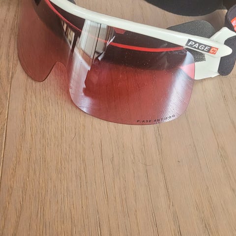 Oakley Radarlock solbriller med to utskiftbare linser. Ramme i sølv med oransje detaljer. Godt brukt med slitasje og noen riper på brilleramme og glass (se bilder), men mye bruk igjen:)